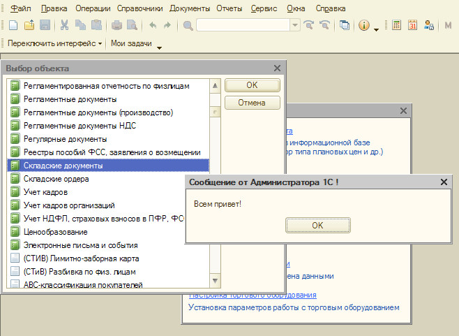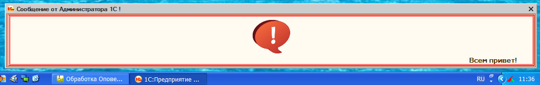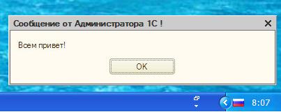 Это всё. Далее в 1С-ке открываем форму Оповещение_пользователей.epf и пишем сообщение. Раз в минуту (значение из кода: "глОбработкиОжидания",60) у всех активных пользователей будет выскакивать предупреждение с заданным сообщением. После выполнения оповещения нажимаем кнопку "Прекратить Вывод сообщения". Будет полезно для информирования пользователей, чтобы вышли из базы на время тех. работ. Раньше приходилось обзванивать :)