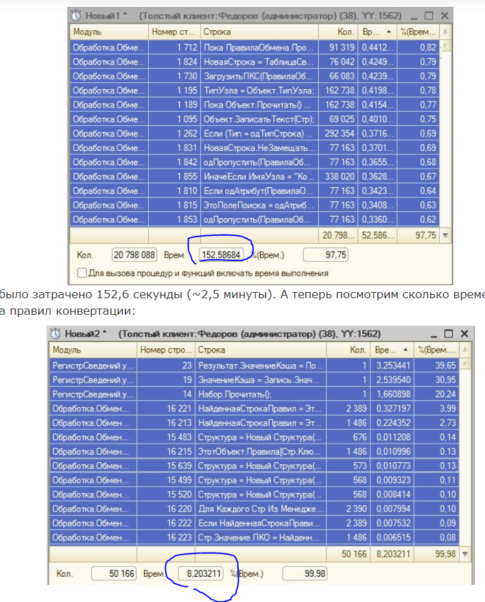 Размер файла XML правил обмена занимает порядка 120 мегабайт. Когда из периферийной базы запускается процедура выгрузки данных, то на этап "Чтение правил конвертации" тратится порядка 5 минут. По условиям задачи обмен должен выполнятся каждые 5 минут, а не чтение правил! Значит придется решить эту проблему. Сначала проанализируем как сейчас выполняется чтение правил обмена.