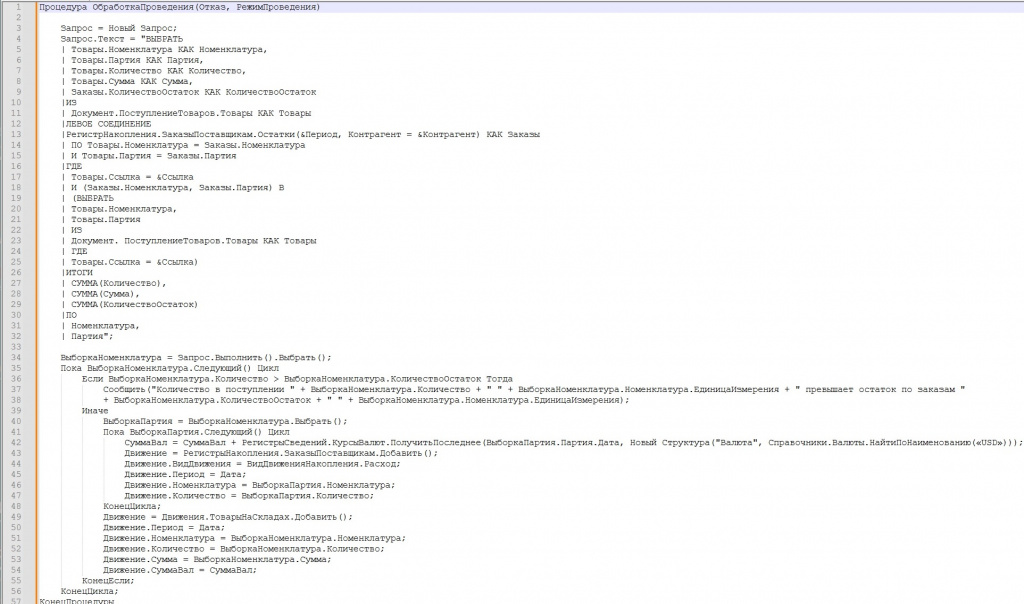 Ниже представлена обработка проведения документа ПоступлениеТоваров.