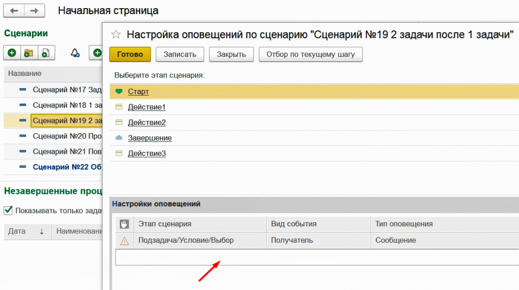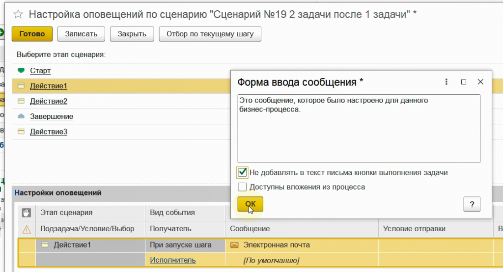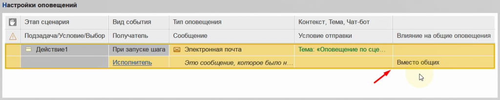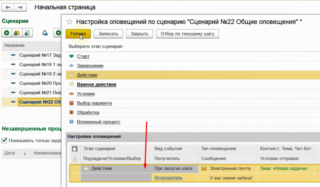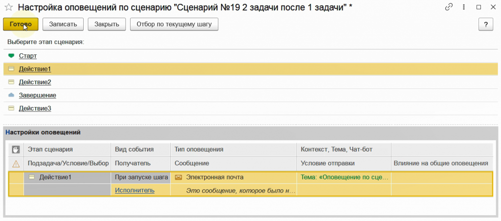 Для примера настроим общее оповещение для шагов вида Действие, то есть для задач.