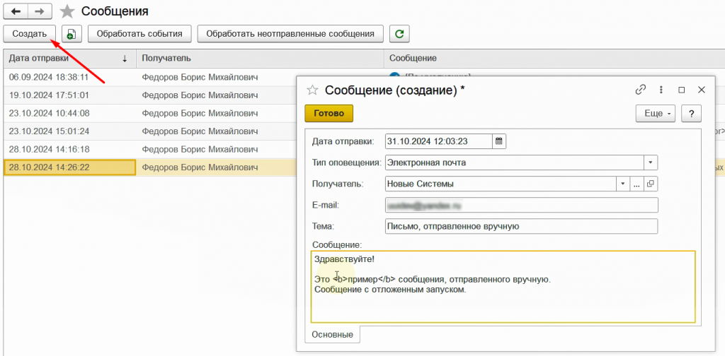 Таким образом, используя список автоматических оповещений, мы можем создать сообщение вручную. В том числе и с отложенной датой отправки.