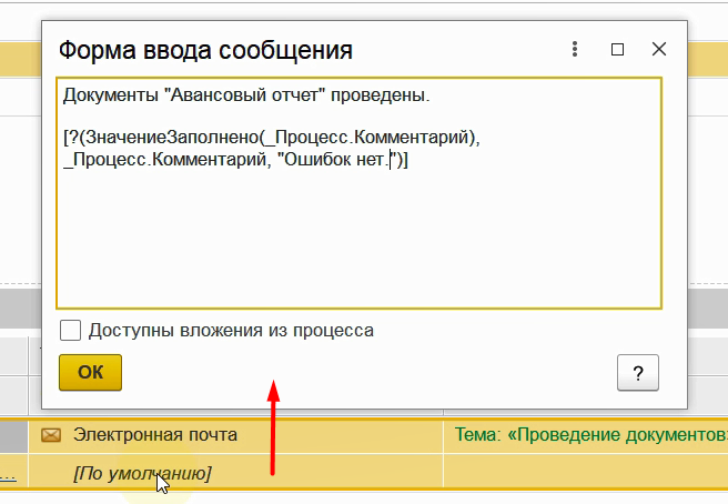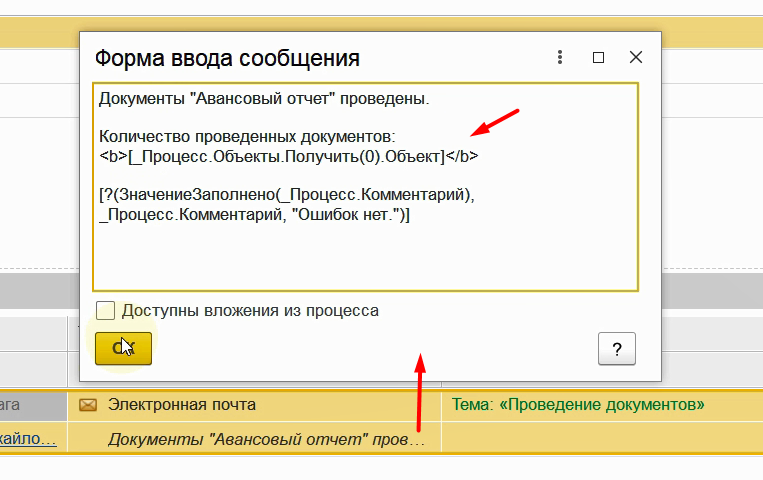 В тексте письма напишем, что документы проведены. И выведем комментарий процесса, в котором могут содержаться ошибки.