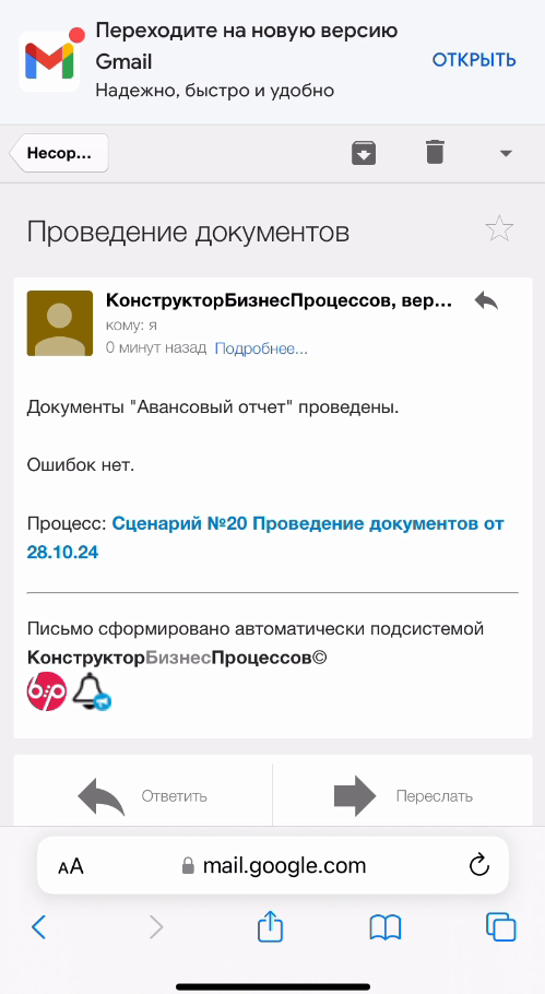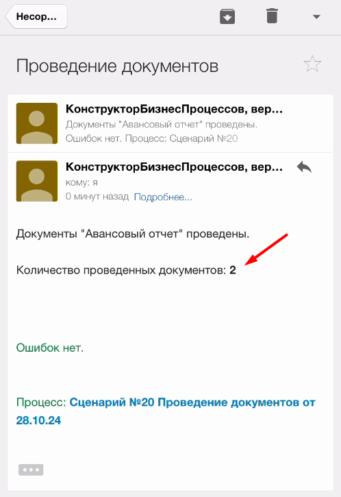 Процесс по сценарию запустился, провел документы, отправил письмо и завершился.