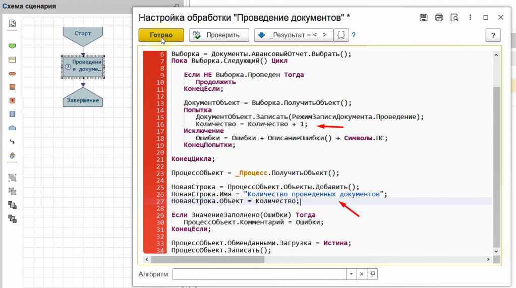 Внесем изменения в сценарий. Посчитаем количество проведенных документов и отправим эти данные в письме.