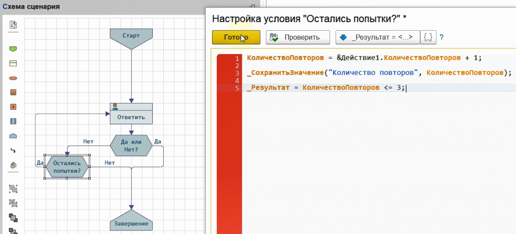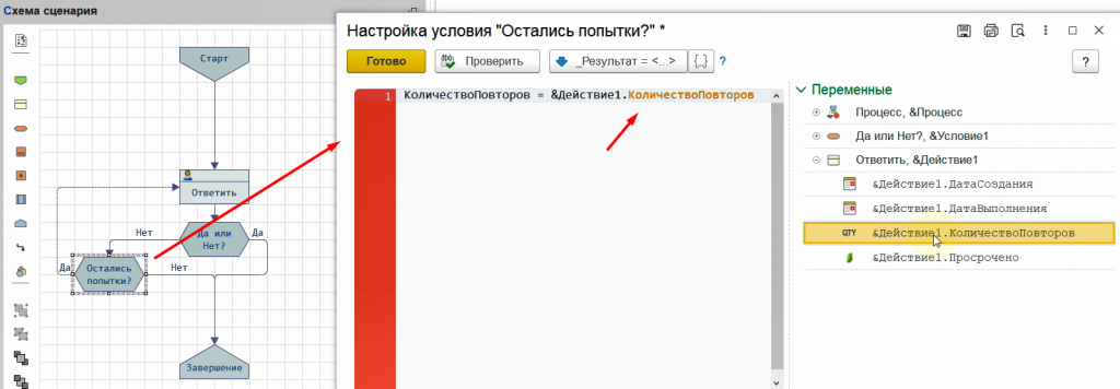 Таким образом мы настроили сценарий с повторением шагов и контролем количества допустимых повторений.