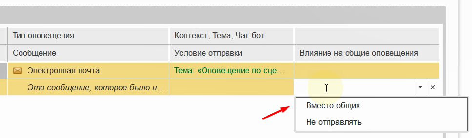 Вернемся в настройку индивидуальных оповещений по сценарию и выберем настройку "Вместо общих".