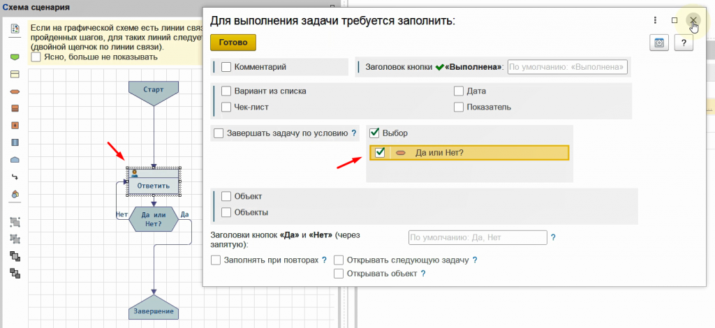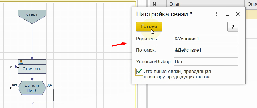 Таким образом, чтобы процесс корректно возвращался к предыдущим шагам, в настройках соответствующей линии связи следует включать признак повтора.