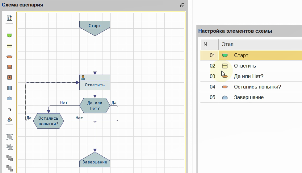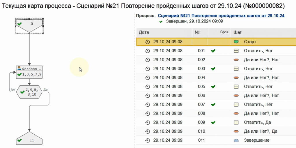 Поэтому, автоматический анализ и контроль повторов отключен, а в сценариях предусмотрена специальная настройка для линий связи, которые приводят к повтору ранее пройденных шагов.