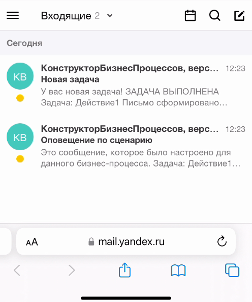 Исполнитель получил 2 письма. 1-ое письмо – это индивидуальное оповещение по сценарию. 2-ое – общее оповещение.