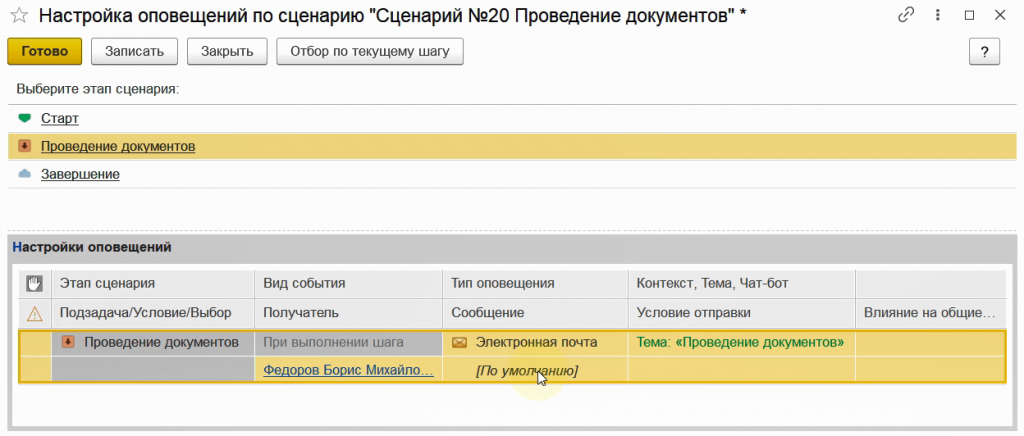 Теперь все оповещения, настроенные для данного сценария, будут общими. То есть отправляться по умолчанию по всем бизнес-процессам.
