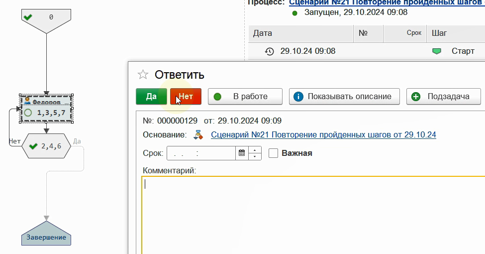 Если мы ответим "Нет". Процесс вернется на шаг задачи, создав новую для повторного выполнения.