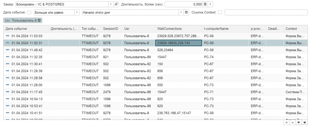 Переходим к замеру с названием «Длительные запросы - 1C & POSTGRES». Применим отбор по пользователю и номеру сеанса, чтобы найти нужные события.