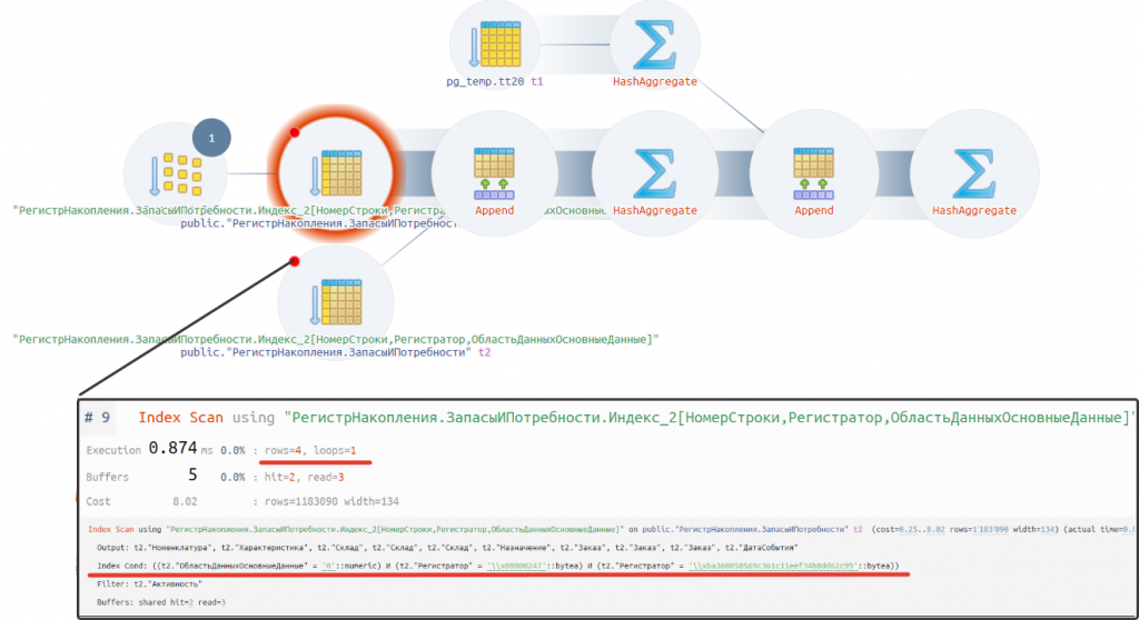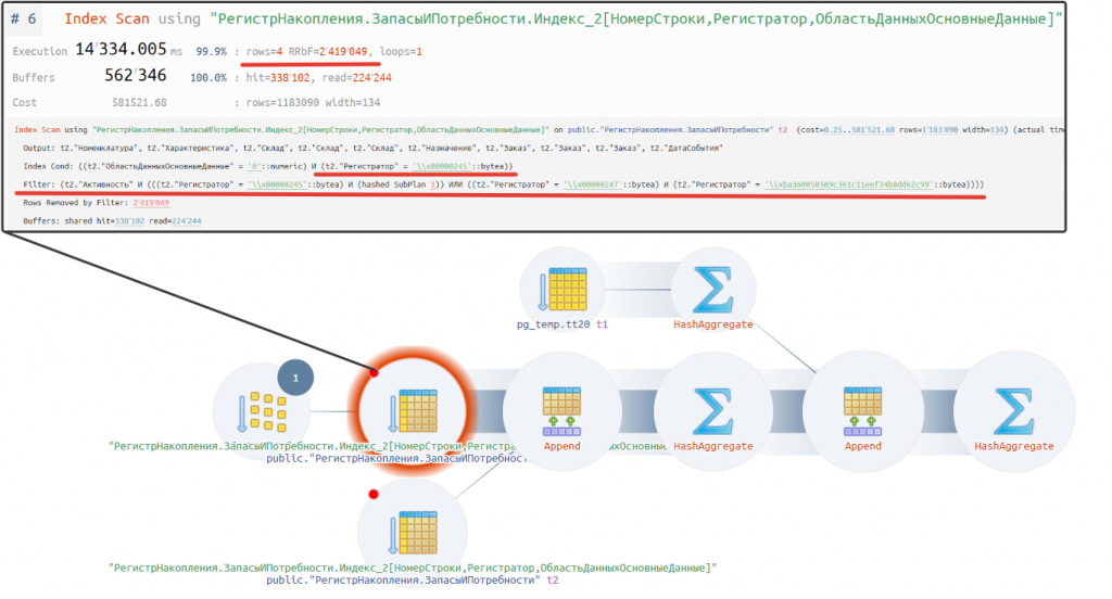 Если мы наведем мышку на этот оператор, то во всплывающем окне появится расшифровка. Давайте посмотрим на нее подробнее. И мы видим, что данные выбираются через индекс регистра накопления «Запасы и потребности», однако эта операция выполняется очень долго. И это неудивительно: в процессе отбирается всего 4 записи, но для этого впустую перебирается почти 2.5 млн строк. На это прямо указывает значение Rows Removed by Filter (RRBF) — количество строк, отброшенных фильтром после сканирования.