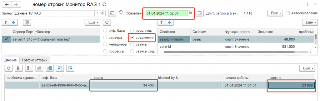 Для этого мы используем замер «Данные 1С RAS». Этот замер хранит информацию о соединениях и сеансах пользователей и сохраняется с интервалом в 60 секунд.