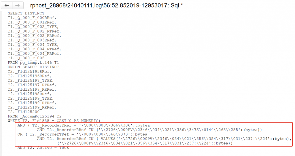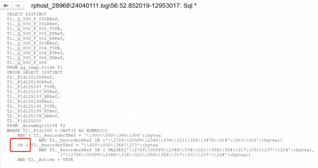 На тексте запроса на языке запросов 1С этого мы не увидим. Тогда посмотрим на SQL-текст запроса. И мы там увидим кое что необычное (выделено на рисунке красным прямоугольником).