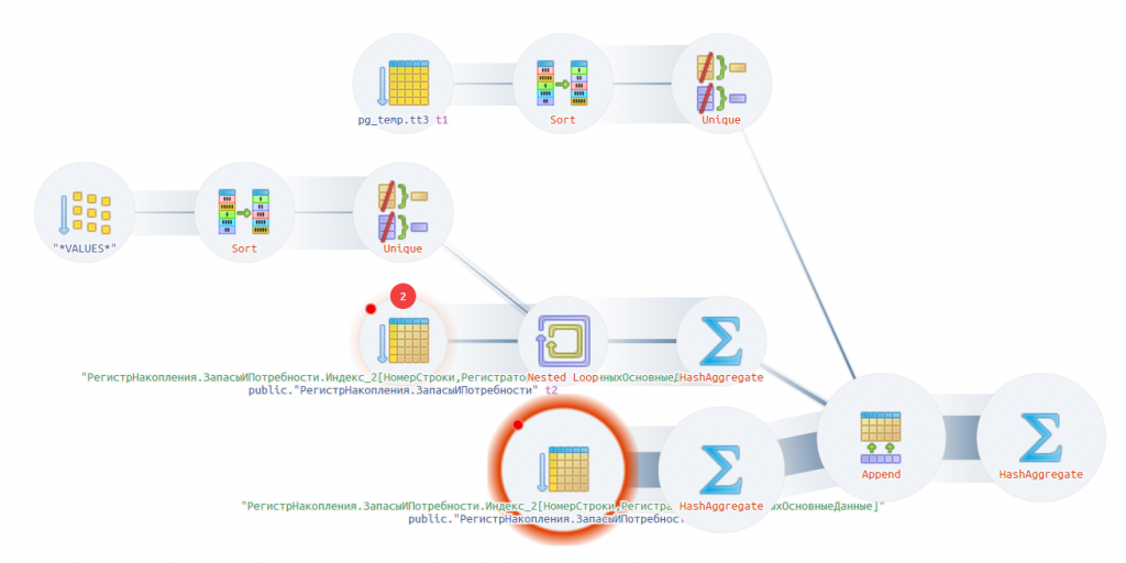 На плане запроса обращаем внимание на самый большой красный круг. Такое явное выделение указывает на наличие проблемы при выполнении запроса. Эта часть плана запроса находится в области выборки данных из регистра накопления. Ее мы и будем рассматривать в дальнейшем.