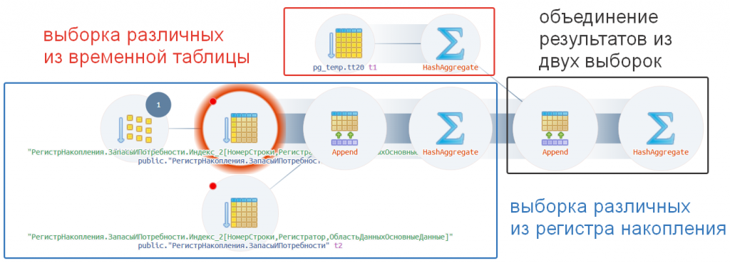 - Нижняя часть плана (синий прямоугольник): Отвечает за выборку данных из регистра накопления.