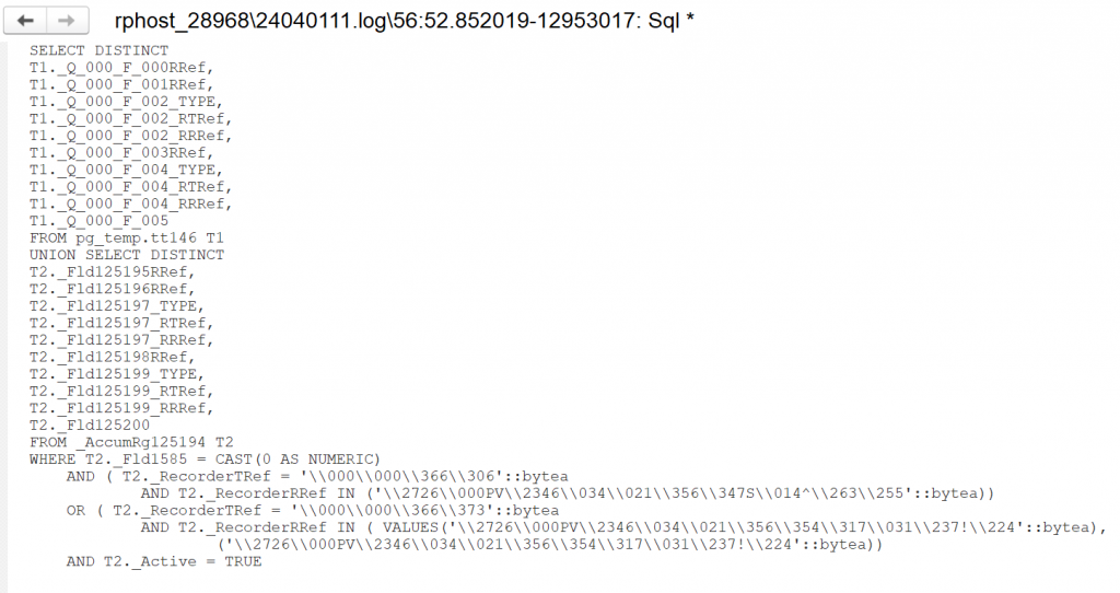 Действительно, мы видим, что в это время существовал некий длительный запрос, который попал в технологический журнал. Отсюда мы можем получить ценную информацию: контекст выполнения (место в коде, откуда был вызван запрос) и текст самого SQL-запроса.