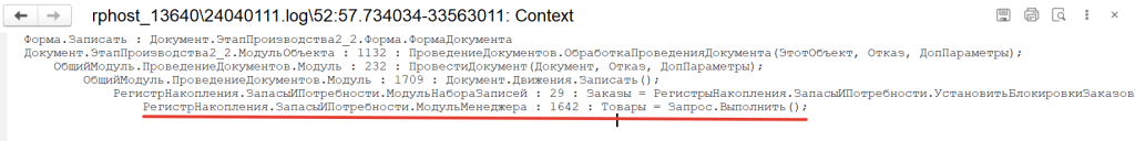 Как мы видим, проблемное событие возникает в модуле менеджера регистра накопления «Запасы и потребности». Теперь, когда мы определили источник проблемного запроса, перейдём к его анализу.