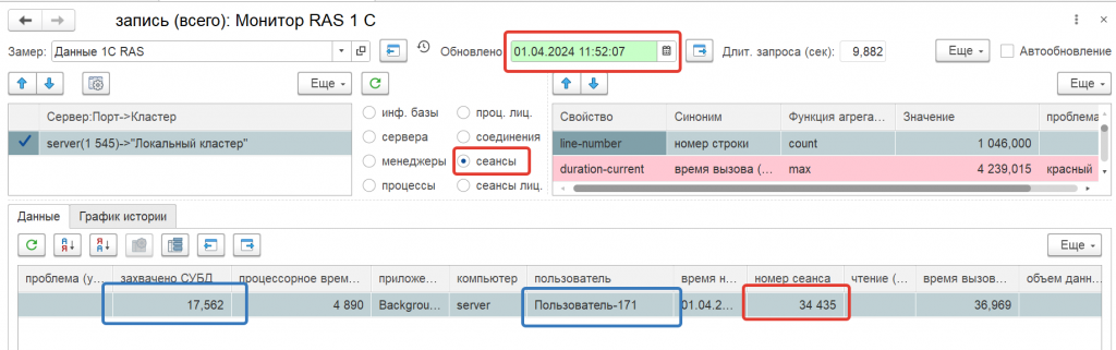 Нас интересует имя пользователя — в данном случае это Пользователь-171. Также стоит обратить внимание на значение в колонке «Захвачено СУБД». Этот параметр показывает время, которое пользователь занимает на получение данных из базы данных, то есть время выполнения запроса. В нашем случае оно составляет около 18 секунд.