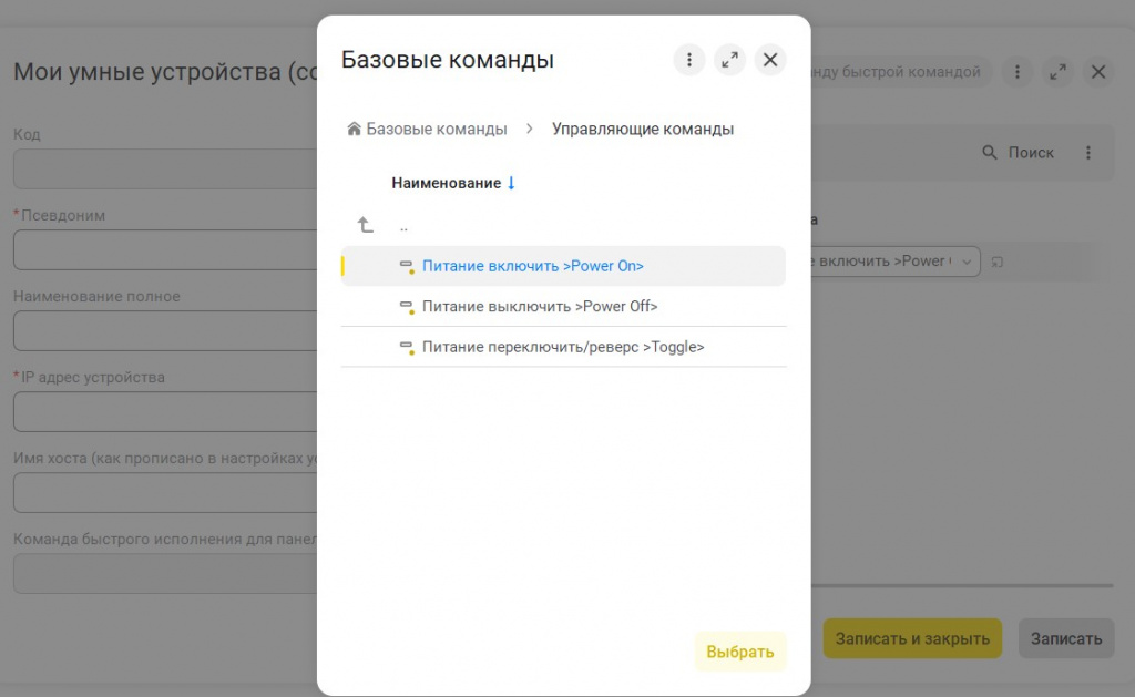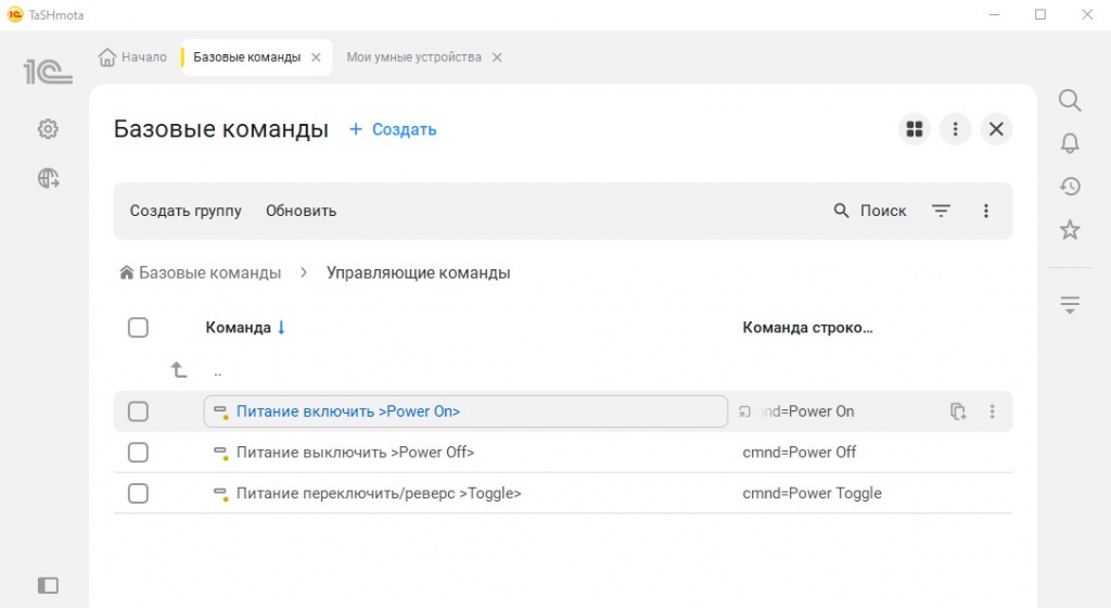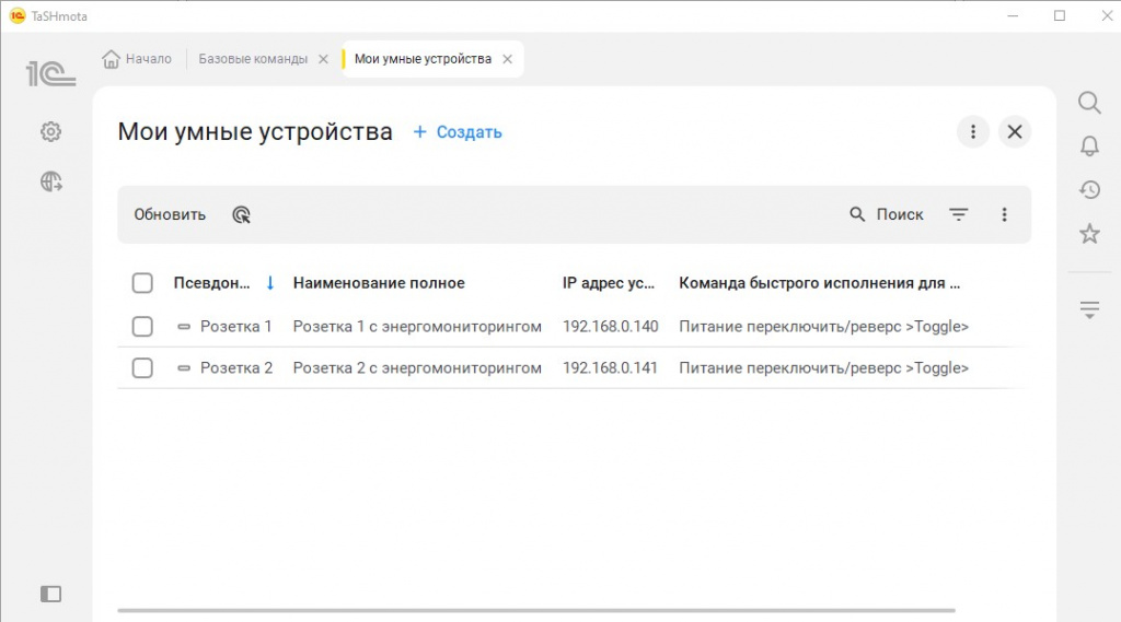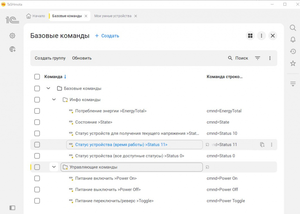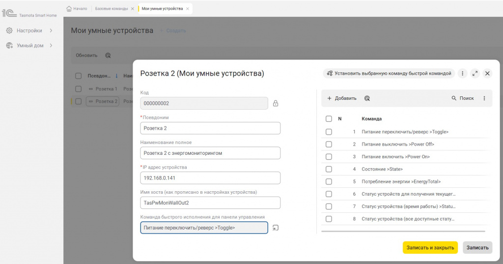 • МоиУмныеУстройства - Мои умные устройства, здесь хранятся реальные устройства, которыми нужно управлять, в таблице хранятся команды, которые оно поддерживает. Тут же, в карточке устройства можно проверить работоспособность команды. Команды заполняются по шаблонам и сразу адаптированы под конкретное устройство.
