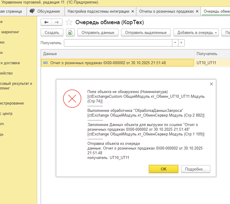 Отправка может занимать значительное время. Например, при передаче данных в ERP – когда речь идет о документе Реализация товаров и услуг на пару сотен строк – обработка проведения может длиться 2 минуты и более. За это время данные в исходной системе могут измениться, причем не один раз. Поэтому по завершении отправки система сверяет версии данных. Если отправленная версия совпадает с актуальной в регистре сведений – все в порядке. Если же нет, требуется повторная отправка объекта.