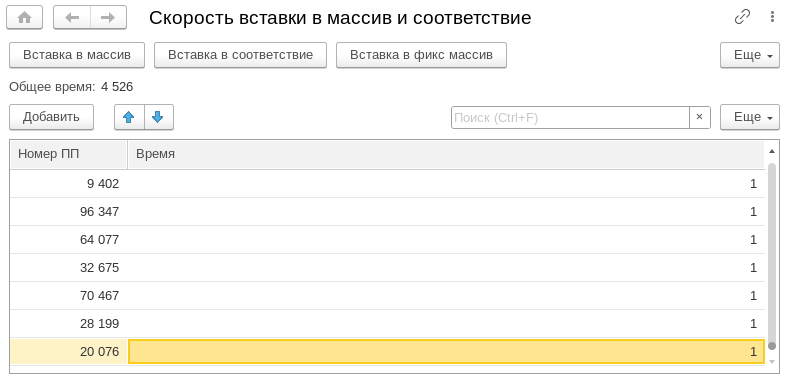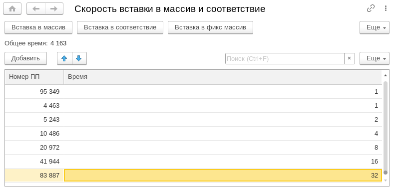 Здесь мы опять использовали алгоритм, с помощью которого уже сравнивали скорость выполнения кода в расширении и конфигурации, и запустили его в 32 и 64-битном клиенте.
