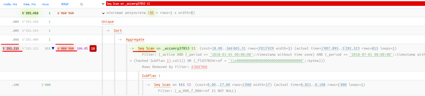 Когда технология понятна, следующим шагом нужно проверить ее работоспособность. Для этого не понадобилось писать патч для Tantor Postgres, достаточно было вручную переписать проблемный запрос и проверить, что все будет работать. Мы так и сделали, и получили подтверждение, что всё работает, и теперь используется индекс по регистратору. Дополнительное подтверждение правильности нашей идеи нашлось в MS SQL Server и Oracle Database: там была реализована такая же технология, более подробно можно почитать о ней здесь. После этого мы уже реализовали данный механизм и в СУБД Tantor Postgres, и в результате получается следующий план запроса: