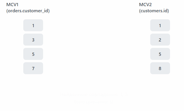 Планировщик должен оценить, сколько строк вернет этот JOIN, чтобы выбрать оптимальный алгоритм выполнения. Это называется оценкой селективности. Представим, что в таблице orders столбец customer_id имеет MCV: [1, 3, 5, 7...], а в таблице customers столбец id имеет MCV: [1, 2, 5, 8...]. PostgreSQL сравнивает эти списки MCV, чтобы понять: