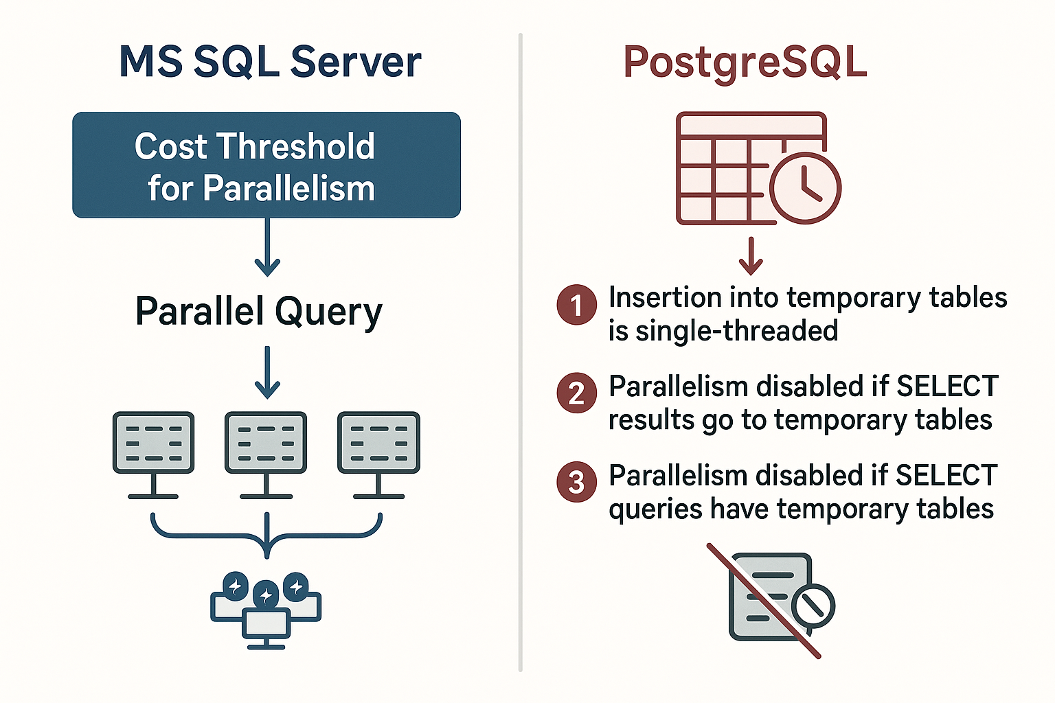 В отличие от MS SQL Server, PostgreSQL забывает, что такое параллелизм, если видит в запросе что-то связанное с временными таблицами. При этом, исходя опыта работы с высоконагруженными базами 1С на MS SQL Server, параллелизм позволяет ускорить большое количество запросов, если правильно настроить параметр Cost Threshold for Parallelism. Чтобы в PostgreSQL начать пользоваться преимуществами параллелизма, нужно решить три проблемы: