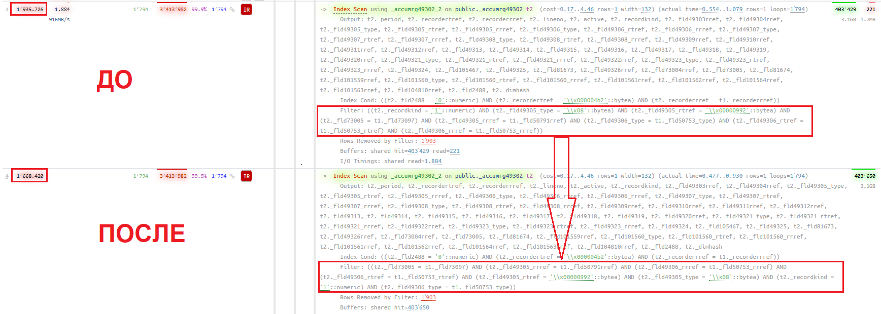 Если сравним эти планы, мы увидим, что в узле Index scan изменился порядок полей в секции Filter: сравнение происходит в порядке уменьшения селективности полей, что позволяет быстрее выполнять фильтрацию. В данном случае ускорение составляет 15%!