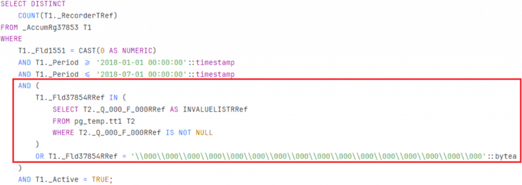 INSERT INTO tt SELECT .. FROM) и вставкой из таблицы значений, переданной в запрос в качестве параметра на стороне 1С (COPY FROM STDIN BINARY); - Когда временная таблица будет содержать данные, то перед тем как использовать ее дальше в запросах, необходимо будет рассчитать по ней статистику, чтобы она не являлась для планировщика «черным ящиком»;