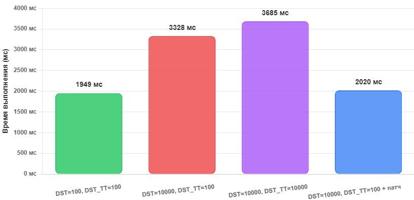 default_statistics_targetдо 10 000 для обычных таблиц приводит к деградации из-за долгого планирования запросов. Производительность падает на 70%. - DST=10000, DST_TT=10000 — увеличение