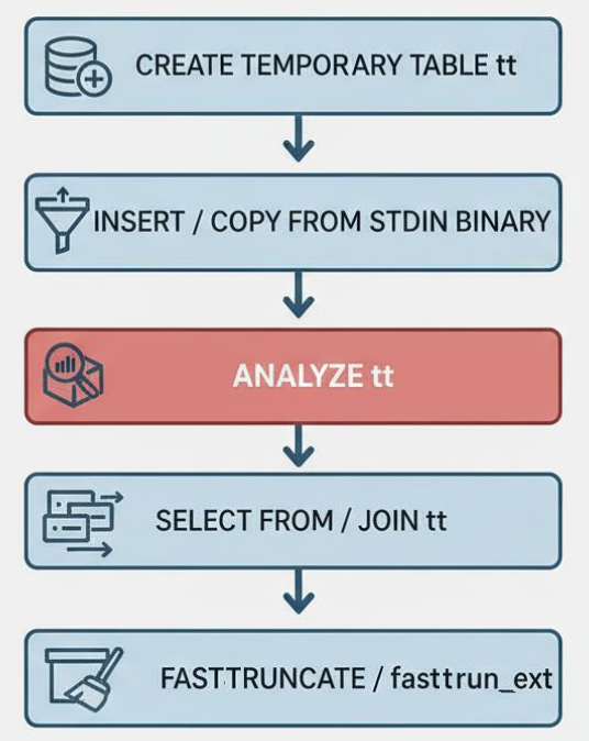 После того, как мы увеличили параметр default_statistics_target, важно понять, какие новые проблемы производительности это может вызвать, особенно в контексте работы платформы 1С с PostgreSQL. Платформа 1С очень любит временные таблицы, давайте рассмотрим их типовой жизненный цикл: