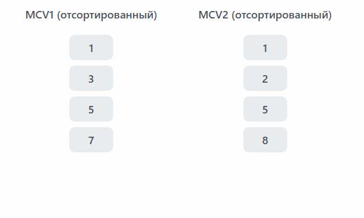 На данном примере с размером 4 обоих списков MCV количество сравнений уменьшилось у нас с 12 до 6. А на списках MCV с 10 тысячами значений количество сравнений уменьшается с 100 млн примерно до 20 тысяч!