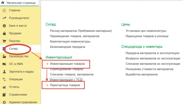 Если пересортица товаров обнаружена в ходе инвентаризации, то для учета отклонений можно использовать документы инвентаризации, которые автоматически создадут корректировки остатков. В системе программ 1С это делается следующим образом: