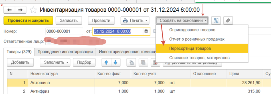 5. После завершения инвентаризации введите документ «пересортица товаров» и проведите документ.