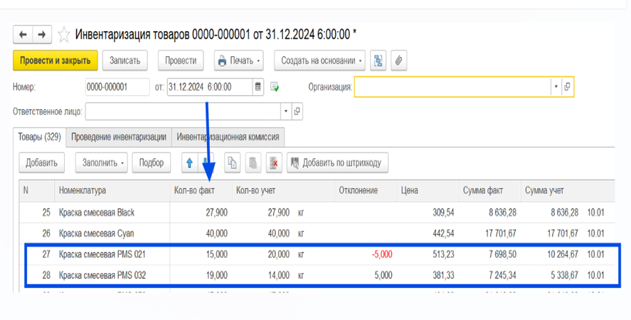 4. Система автоматически рассчитает расхождения между фактическим количеством и данными учета.