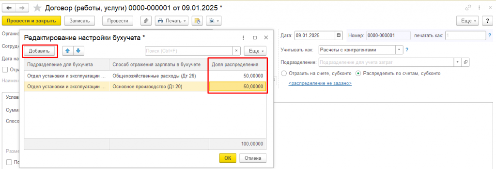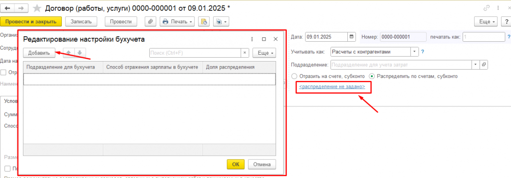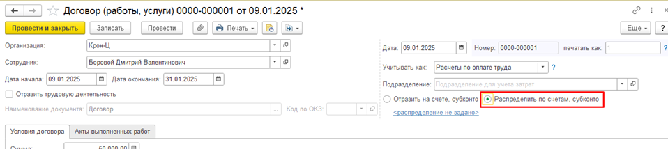 В результате выбранной настройки в документах Договор (работы услуги), Договор авторского заказа, Акт выполненных работ, а также в документах для выплаты разовых доходов, пользователям станет доступен функционал «Распределить по счетам, субконто» для редактирования (Рисунок 2).
