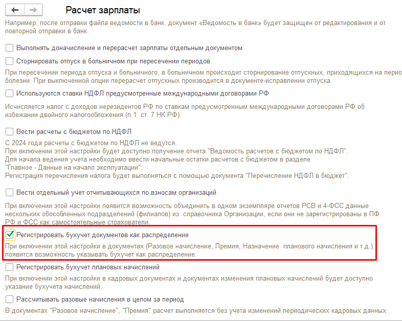 С выходом нового релиза 3.1.29.78 появилась возможность более гибкого распределения вознаграждений за оказанные услуги между несколькими бухгалтерскими счетами. Чтобы воспользоваться этой функцией, необходимо зайти в настройки (раздел Настройка – Расчет зарплаты) и выбрать опцию «Регистрировать бухучет документов как распределение» (Рисунок 1).