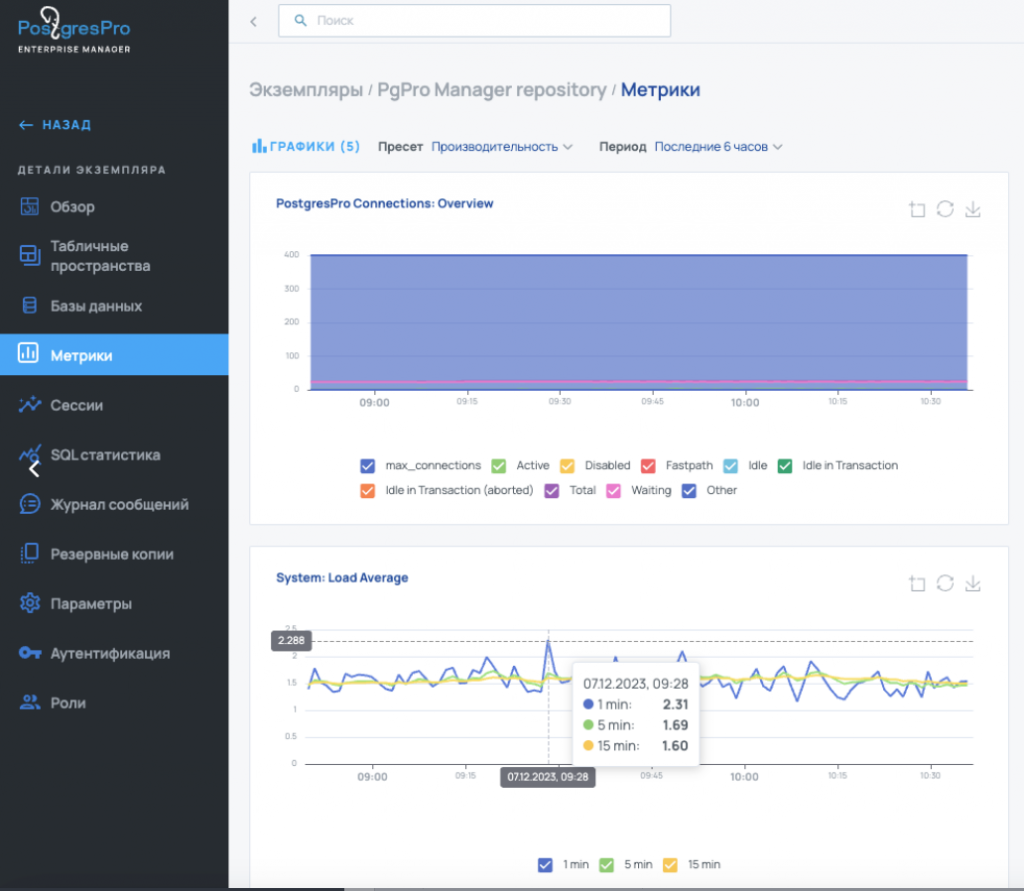 Отдельно стоит упомянуть умный мониторинг. Решение также позволяет отслеживать работу СУБД, собирать метрики оборудования и при необходимости кастомизировать их: добавлять произвольные запросы и строить по ним графики, работать с ТЖ, ЖР и так далее.