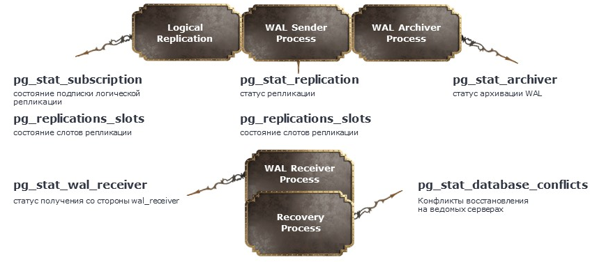 За чем же нам нужно наблюдать? За внутренними механизмами PostgreSQL, такими как: