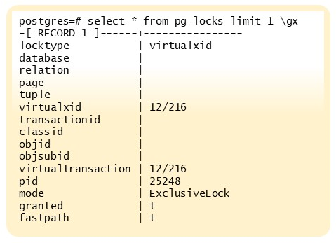 Для анализа наложенных блокировок существует представление pg_locks. С его помощью можно получить информацию о том, какие блокировки установлены, какими процессами они удерживаются и какие ресурсы затронуты.