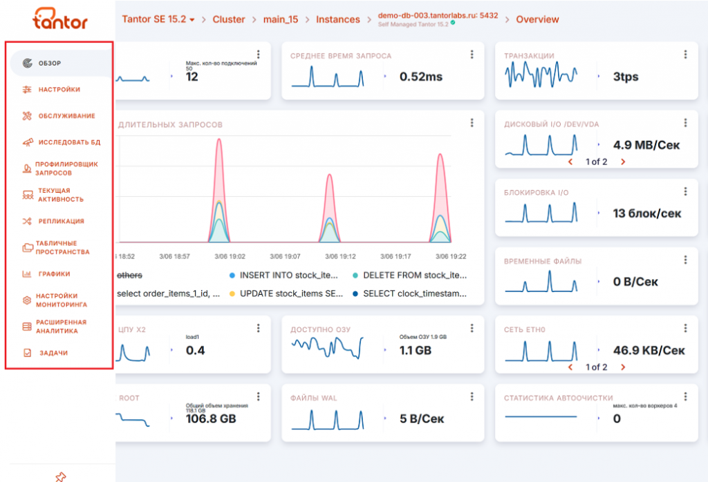 На примере отчета видно, что можно получить данные за определенный период работы СУБД: нагрузку, активность запросов, статистику по объектам и многое другое.