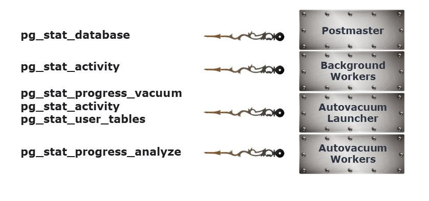 С помощью представлений pg_stat_database, pg_stat_activity, pg_stat_progress_vacuum, pg_stat_user_tables, pg_stat_progress_analyze мы мониторим работу bloat и минимизируем влияние автоочистки на систему.
