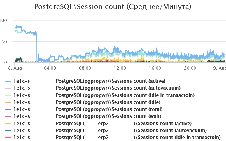 На графиках, построенных по этим метрикам, хорошо виден значительный пик нагрузки. Он пришелся на момент восстановления одной из баз данных в кластере.