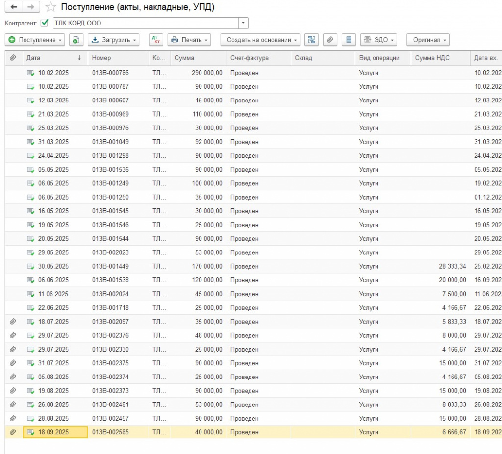 После этого у нас в поступления появится столбец "Сумма НДС". Чтобы сумма отобразилась, нужно провести документ.