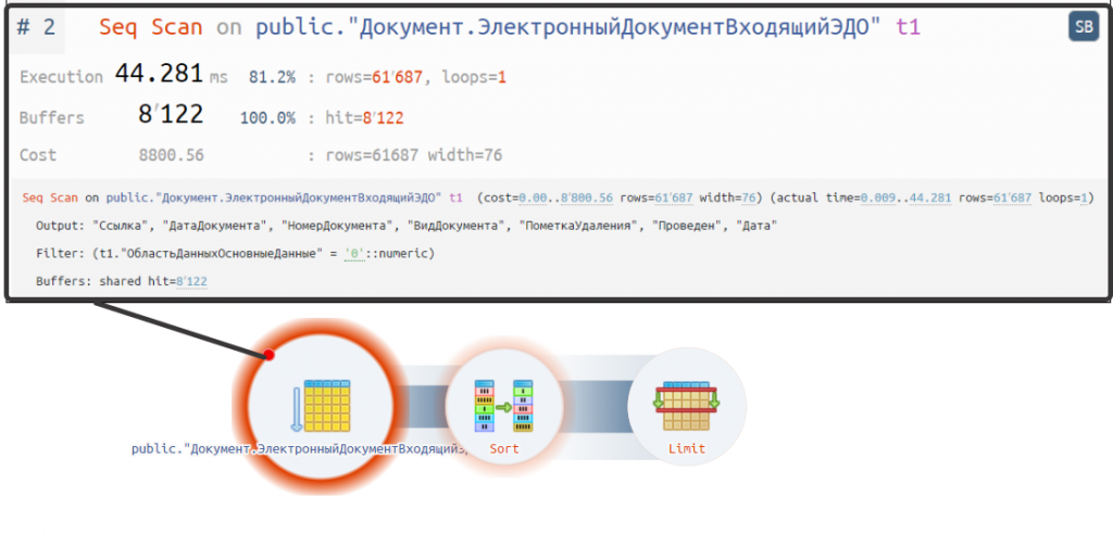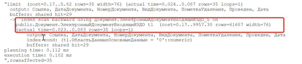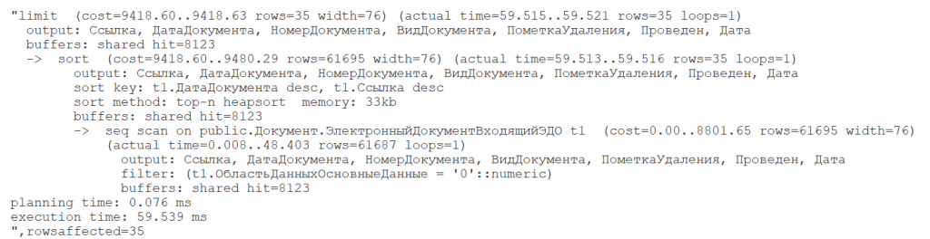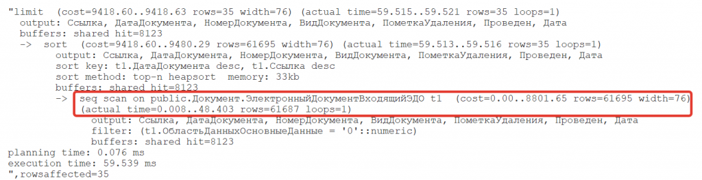 Проблема: Для возврата всего 35 строк СУБД вынуждена выполнять последовательное сканирование (Sequential Scan) всей таблицы документа, что отмечено на рисунке ниже красной рамкой (см. рис ниже и выделения красным прямоугольником).