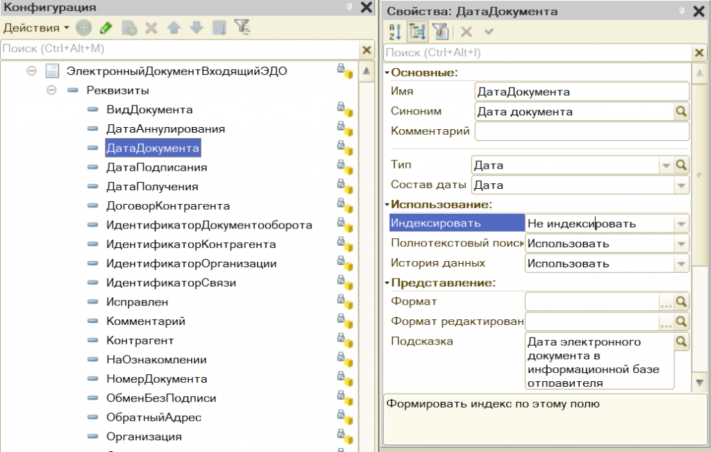 • Для его реквизита «Дата документа» свойство «Индексировать» было изменено с значения «Не индексировать» на «Индексировать».
