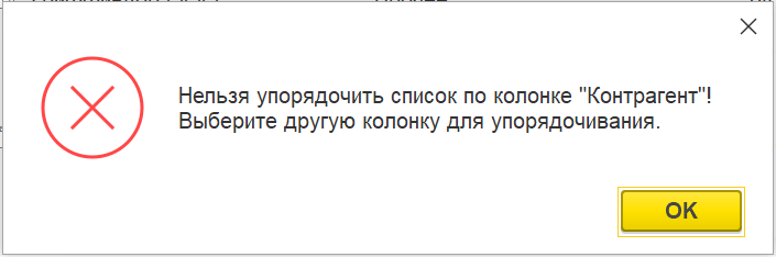 Рис. 12. Сообщение об ошибке при попытке сортировки по заблокированному полю "Контрагент"